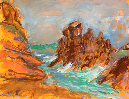 Het is met name in de schilderingen van de genoemde rotsformaties dat ik de laatste tijd ontdek hoe ongelofelijk transparant het schilderen van Paul Werner is geworden. Natuurlijk helpt de snelle gouacheverf hem daarbij, die immers alert en scherp invallen en impulsen laat noteren. Ook zijn emotionele, nerveuse toets doet hierin mee, maar ook deze wordt ondanks alles onmiskenbaar ruimtelijk aangestuurd. Er is in zijn gouaches nauwelijks massiviteit van vormen te vinden die zich introvert afwillen sluiten van de rest van het schilderij. Ook geen vormen die zich hard en gesloten neerzetten in het vlak, afgescheiden van de rest. Wonderlijk open staan zijn geschilderde rotspartijen in de zeezichten en kustentaferelen uit Bretagne. Rotsen die op papier als het ware opnieuw zijn opgebouwd in een intuitieve, transparante architectuur. Ze verbinden zich vanzelfsprekend met de lucht en met de woelingen van het water. Water en lucht zetten zich moeiteloos in hen voort, en hun krachten worden er slechts tijdelijk in opgeslagen. Het is slechts heel oppervlakkig dat ik aan de dominante demonen van Max Ernst moet denken. Want bij hem staan de blinde aardkrachten dreigend en zwaar aan de horizon van het leven tegen een dichte blauwe lucht. In de gouaches van Paul Werner staan de demonen niet grotesk overeind; in zijn kustlandschappen spoelen ze mee, heen en weer met de schuimende golven. Ze huizen slechts tijdelijk in hun rotsgedaante, om kort daarna weer terug het licht in te springen om mee te gaan.